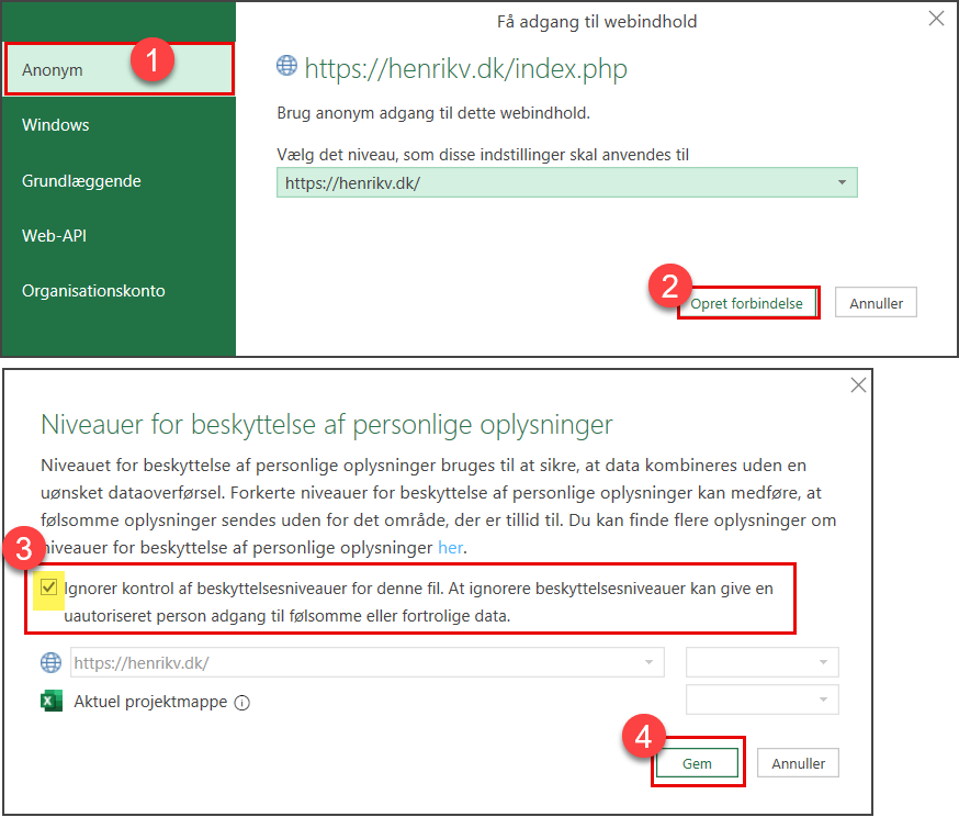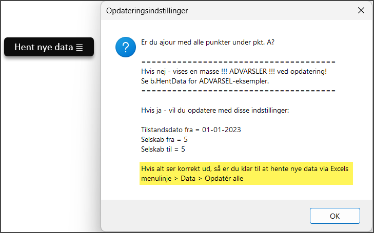 Popup ved klik på Hent nye data advarer nu om fejlmeddelelserne, som kommer, hvis man glemmer at sætte Excel indstillingerne jf. fanens pkt. A